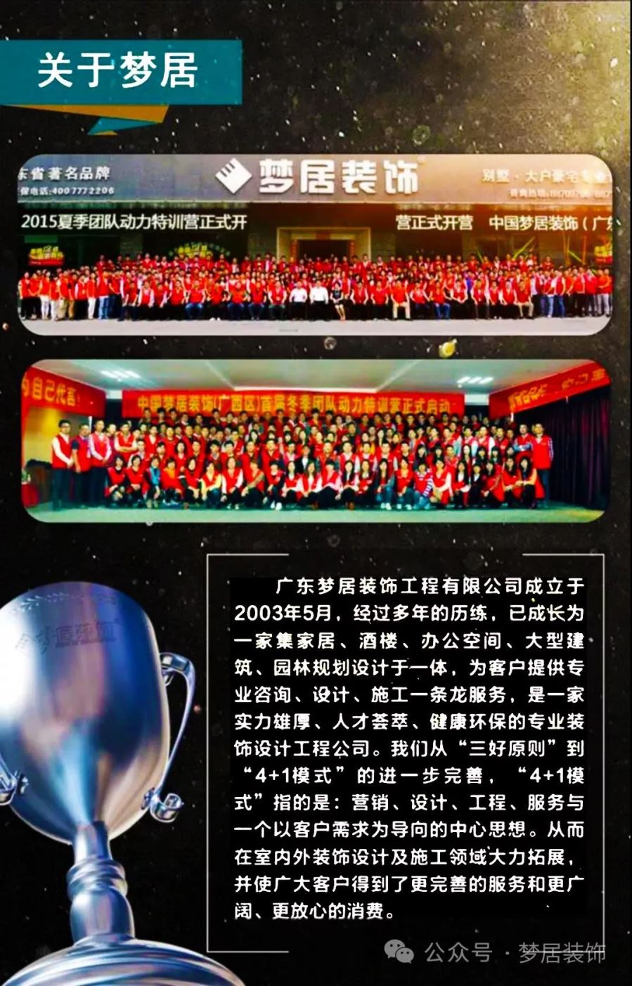 廣東夢居裝飾成立于2003年,經過多年的歷練,已成長為一家集家居、酒樓、辦公空間、大型建筑、園林規劃設計于一體,為客戶提供專業咨詢、設計、施工的一條龍服務,是一家實力雄厚、人才薈萃、健康環保的專業裝飾設計工程公司。
