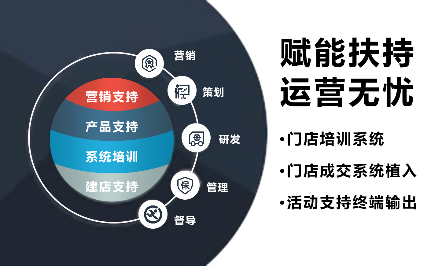 專業(yè)團(tuán)隊跟蹤指導(dǎo) 開業(yè)駐點支持、專業(yè)營銷方案輸出、團(tuán)隊輸出,與前線人員一起戰(zhàn)斗。