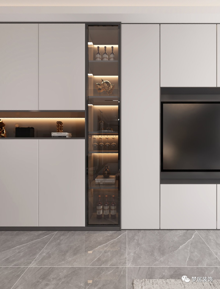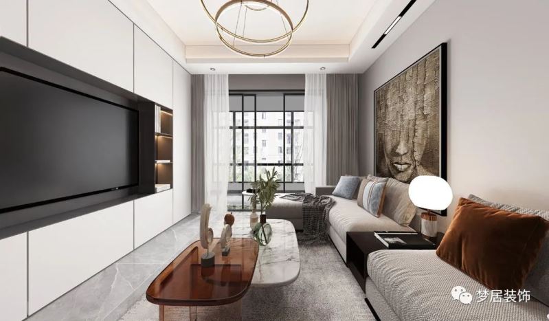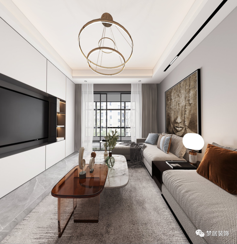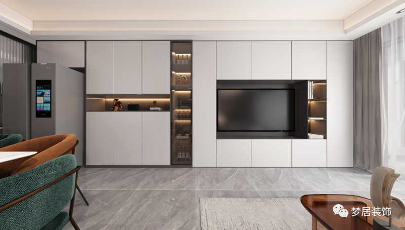 現代簡約設計風格追求自由,室內空間開敞通透。電視背景墻為整排收納柜滿足收納所需,電視內嵌讓視覺更整體。使用玻璃、不銹鋼等新型材料作為輔材,給人的感覺前衛大氣。