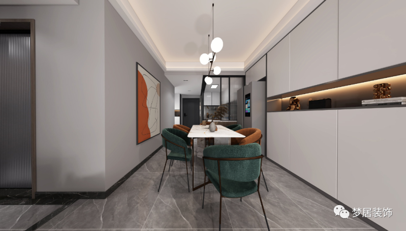 極具現代感的造型燈和家具美觀與實用并存,金屬獨特的光澤使家具倍感時尚。高純度色彩掛畫打破空間的平緩,紅橙色的使用大膽而出彩。半開放式廚房使空間更通透明亮。