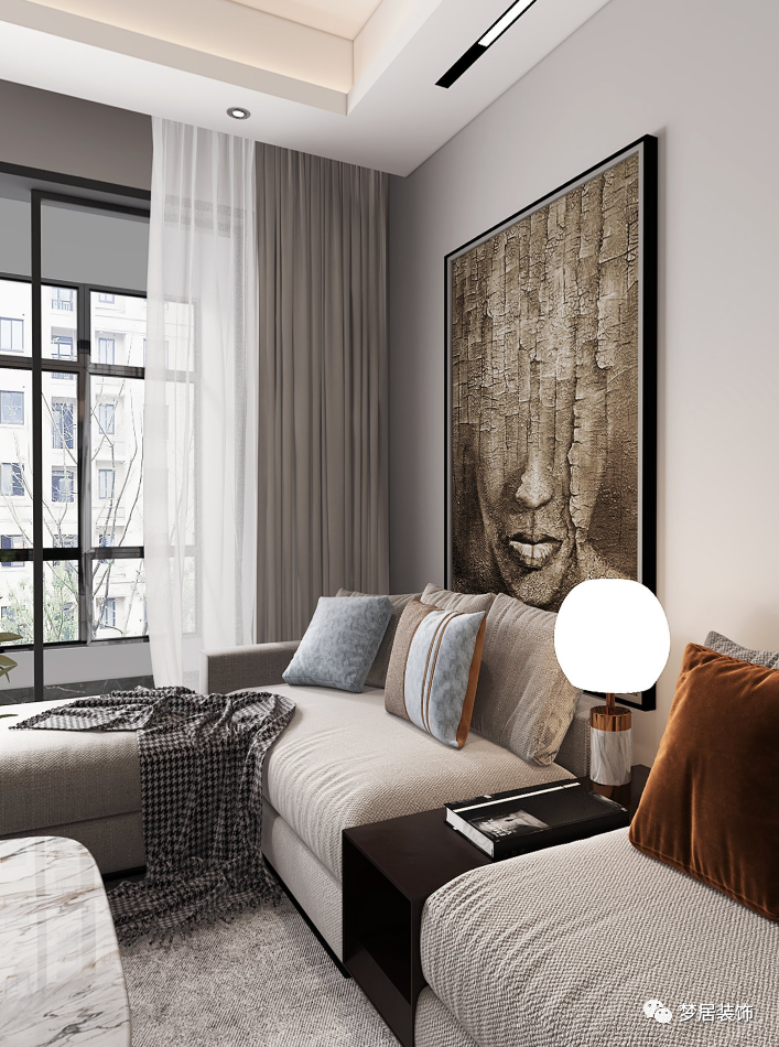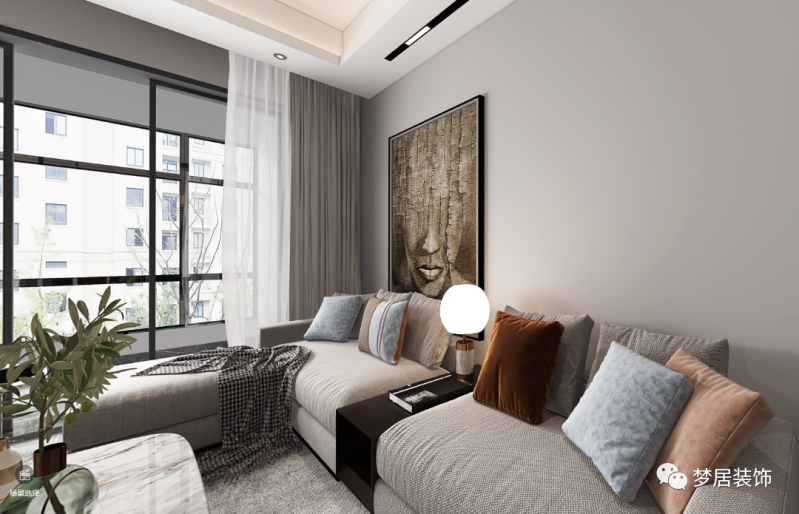布藝沙發柔軟舒適,絲絨質感的抱枕為空間增加時尚華麗的效果。藝術掛畫打造時尚氛圍,彰顯個性。搭配綠植使居室愜意,輕松。少量的裝飾元素,通過完美的軟裝搭配同樣彰顯空間美感。