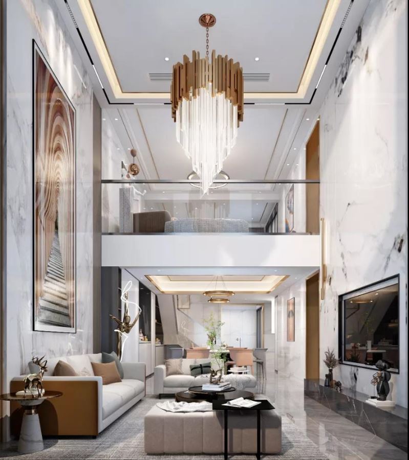 客廳空間質感飽滿。造型別致的吊燈垂吊于一、二樓客廳之間,空間燈光交相輝映;黃銅勾勒細節,在空間中演繹一種“低調的奢華”。