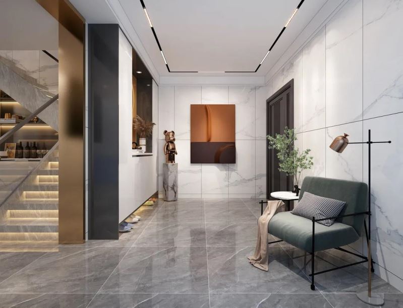 大量天然大理石鋪設,低調奢華;樓梯扶手采用玻璃與拉絲不銹鋼的結合,質感滿滿;梯級之間加設燈帶,令空間增色不少。