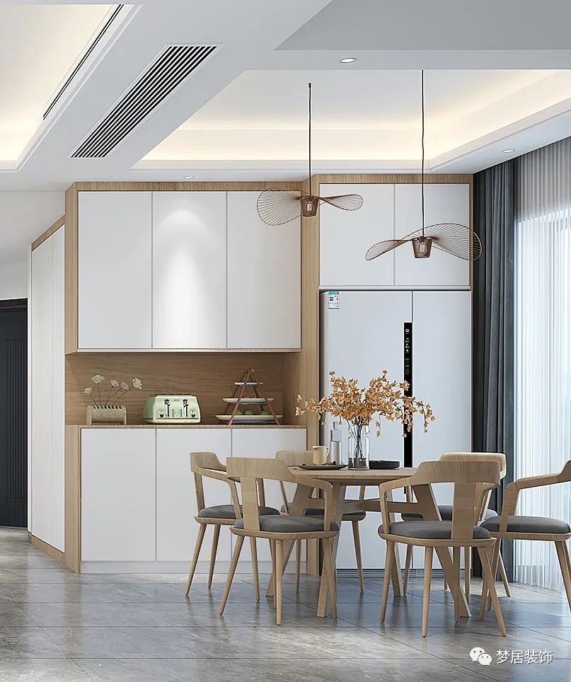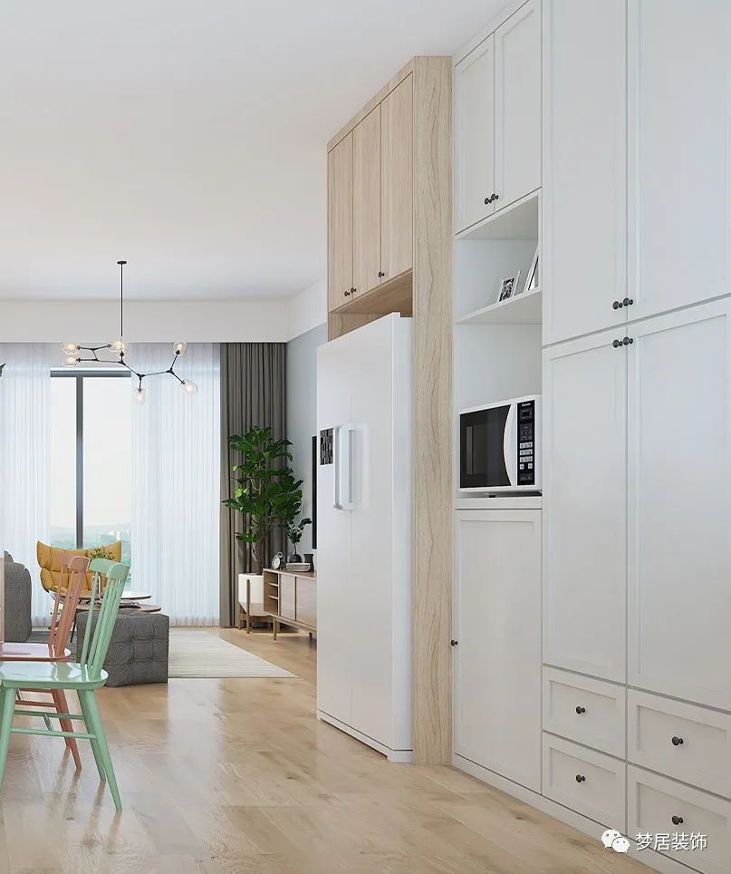 冰箱的厚度比日常的餐邊柜要厚一些,冰箱部分的柜子可以和冰箱做到同一水平面,剩余部分餐邊柜還是保留原有厚度。若追求厚度一致,柜子看起來就會比較“笨重”。