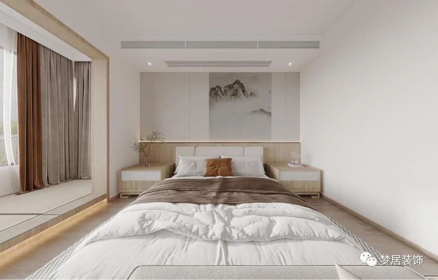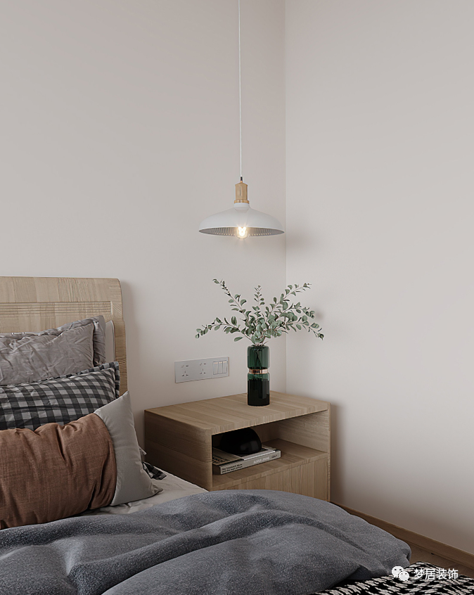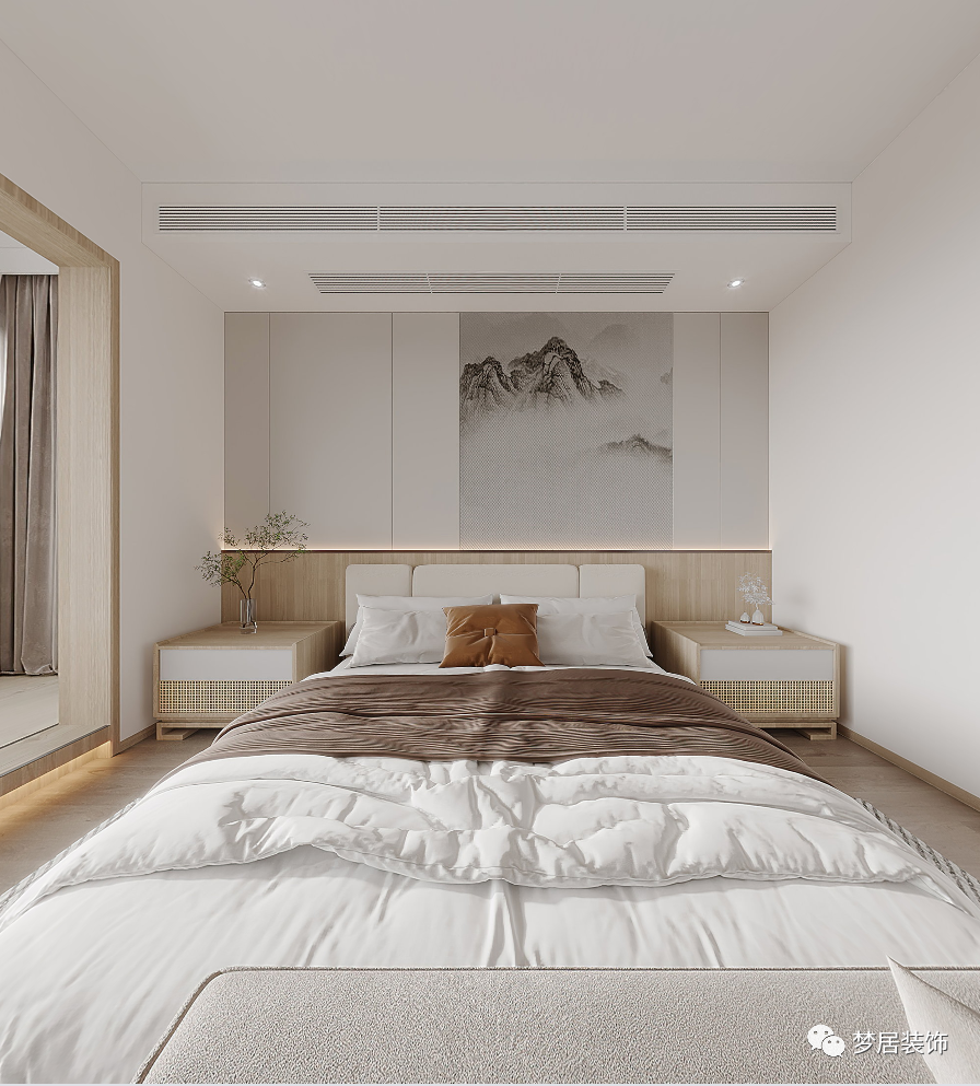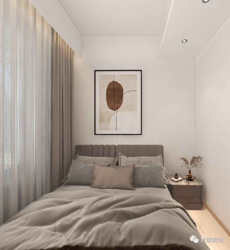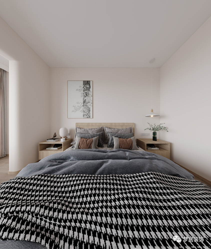 客臥溫馨自然、簡約大方,柔軟的布藝材質豐富了整個空間質感,極簡的線型吊燈和掛畫也讓整個空間增加了趣味。