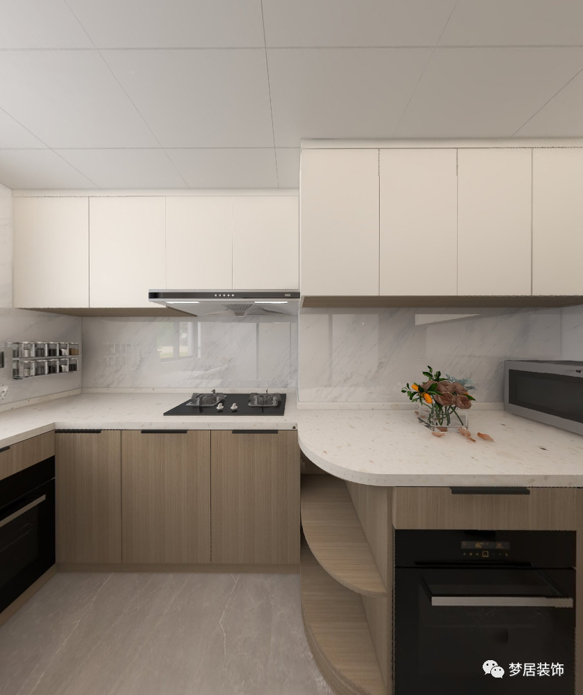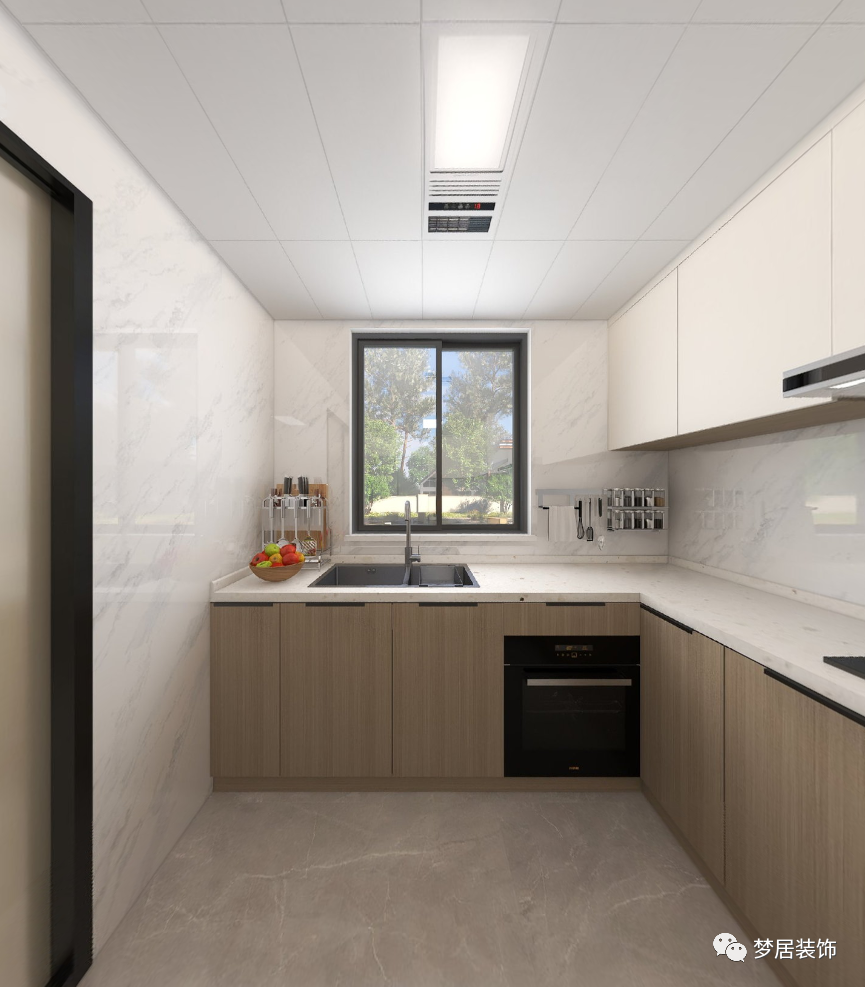 廚房以簡潔的線條分割營造干凈爽朗的空間感,大面積的木色溫潤了空間的的溫度,也提升了空間質樸感受。