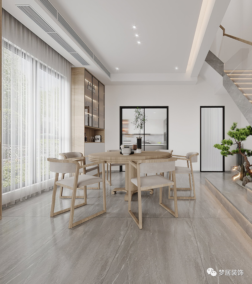 餐廳木質餐桌椅給空間增添了自然質樸的格調,空間就餐的溫度與禮序,營造生活溫度。