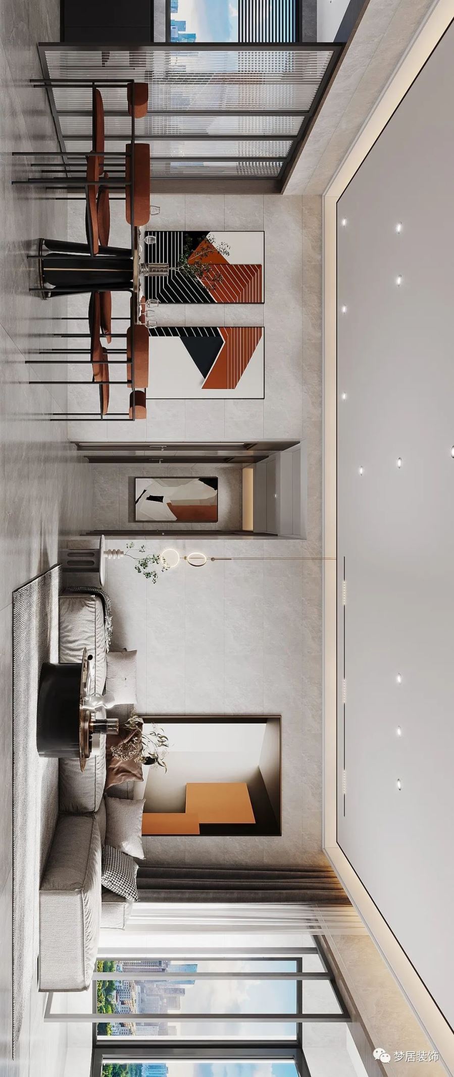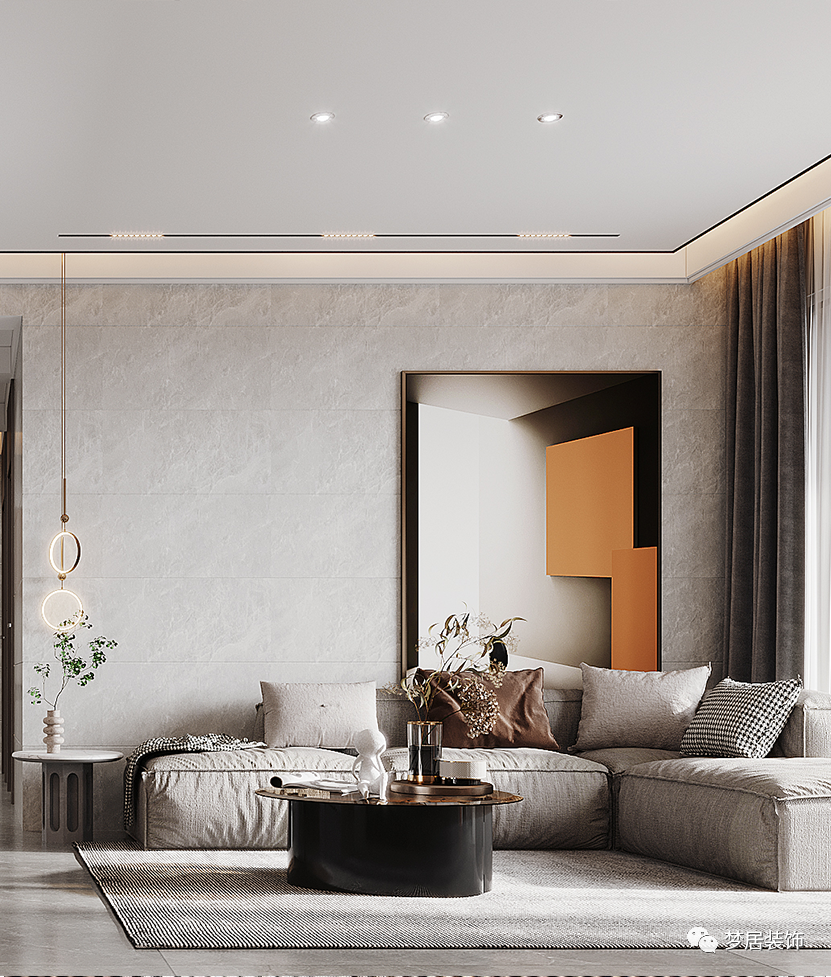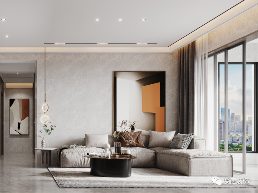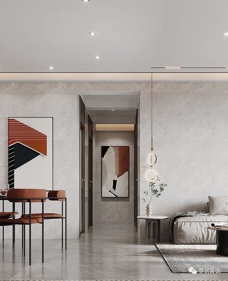 入戶玄關設置了鞋柜和物品收納區域,方便業主日常生活所需。入戶的設計也為室內空間起到了一個緩沖的作用,保持室內空間的私密性。客廳搭配淺灰色地磚通鋪,“無主燈”設計令空間更加舒適寬敞。偏硬朗的現代風格簡潔大氣,簡約隨性的布藝沙發搭配大幅現代畫作,極具設計感,干凈利落的線條簡潔優雅,復古的橙色在現代空間中碰撞出不一樣的時尚感。臥室地面采用木地板鋪貼更溫馨,整墻衣柜滿足收納,借助飄窗設計出梳妝臺,節省空間區域。時尚的現代手法呈現出年輕人所青睞的新時代理想居所。