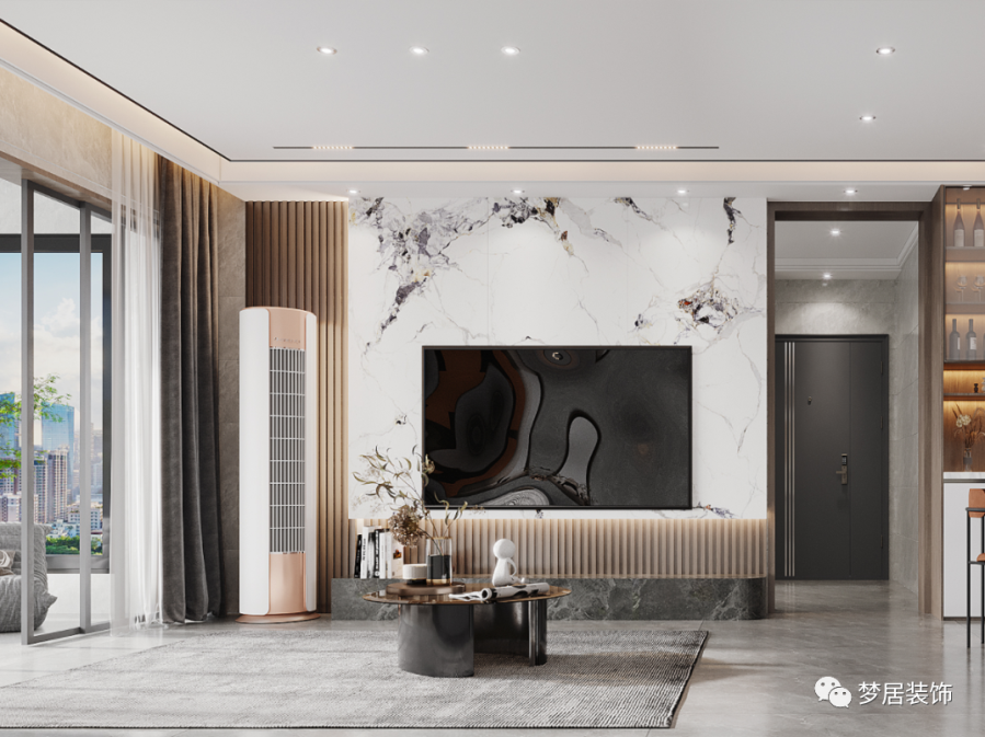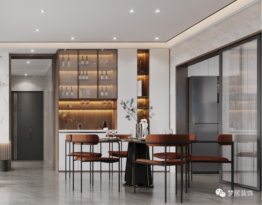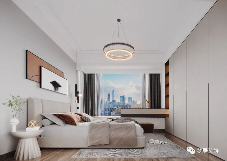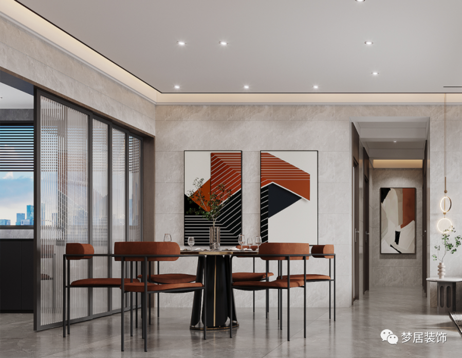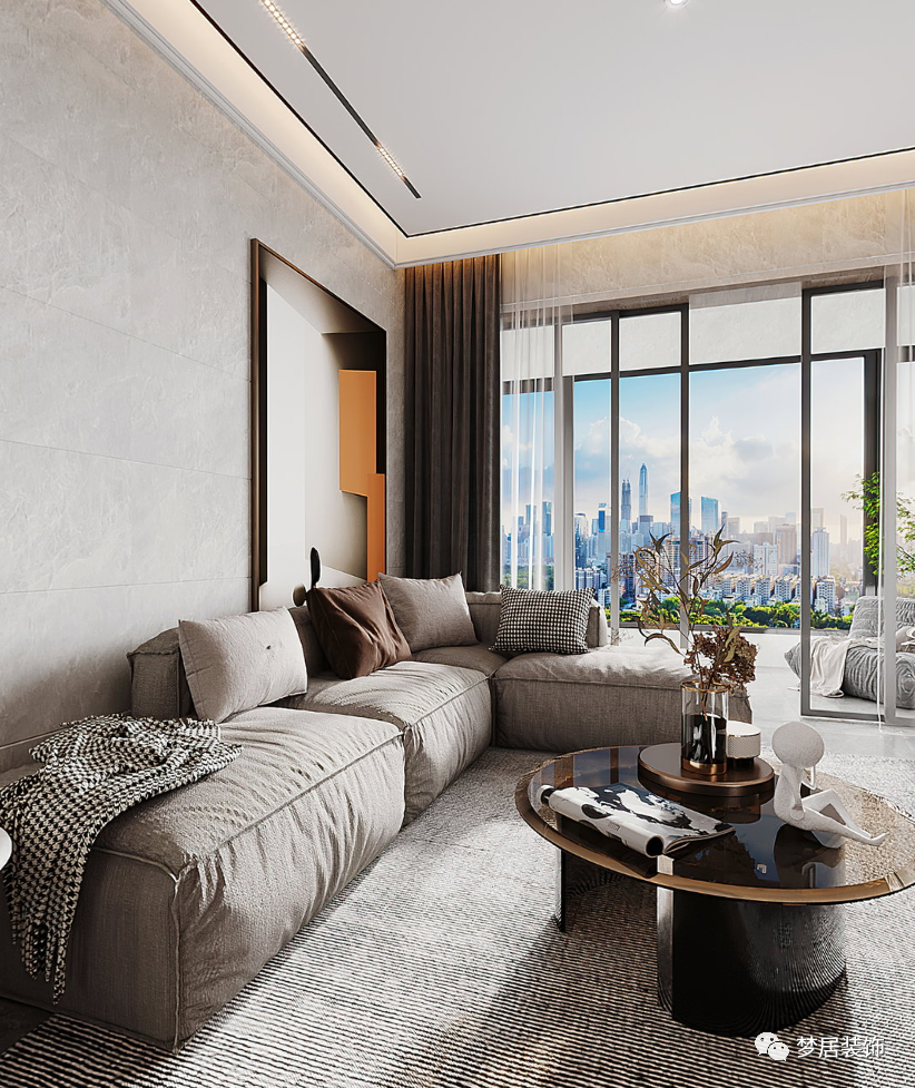 入戶玄關設置了鞋柜和物品收納區域,方便業主日常生活所需。入戶的設計也為室內空間起到了一個緩沖的作用,保持室內空間的私密性。客廳搭配淺灰色地磚通鋪,“無主燈”設計令空間更加舒適寬敞。偏硬朗的現代風格簡潔大氣,簡約隨性的布藝沙發搭配大幅現代畫作,極具設計感,干凈利落的線條簡潔優雅,復古的橙色在現代空間中碰撞出不一樣的時尚感。臥室地面采用木地板鋪貼更溫馨,整墻衣柜滿足收納,借助飄窗設計出梳妝臺,節省空間區域。時尚的現代手法呈現出年輕人所青睞的新時代理想居所。