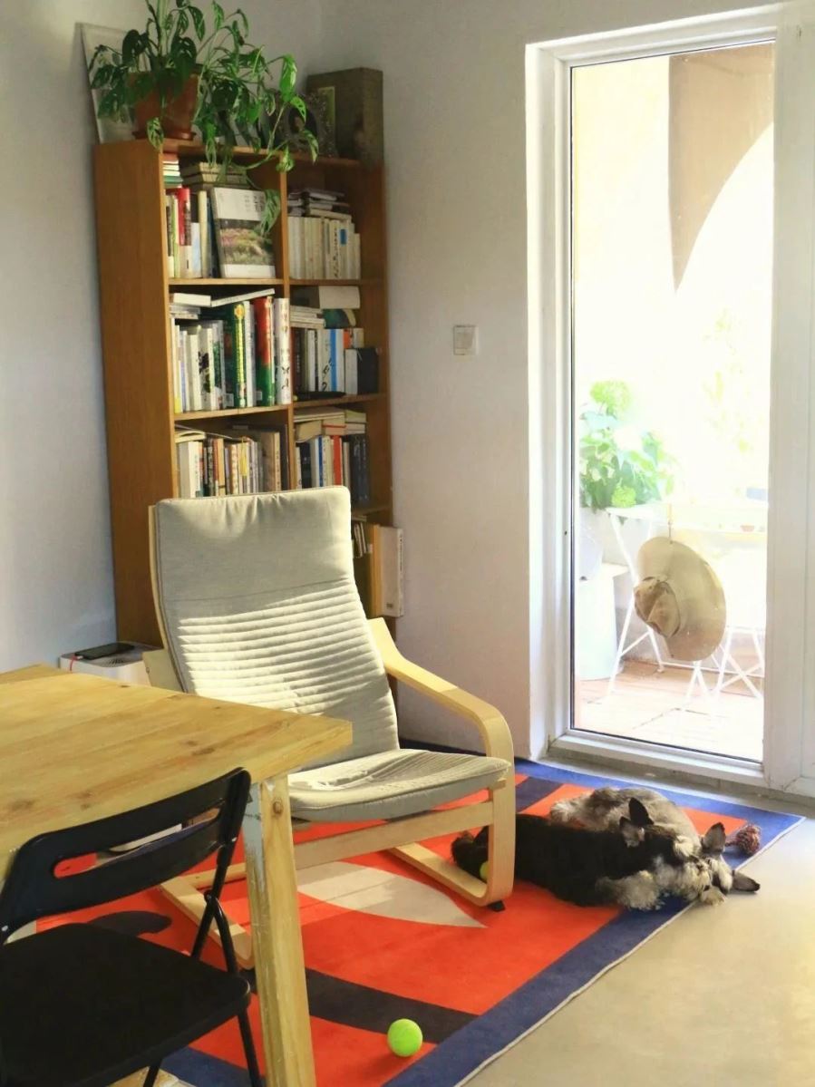 因為毛坯房住起來會比較沉悶,所以入住時選了很多色彩鮮明的家具,大部分都是很便宜的裝飾,最主要的支出是在家具、家電、軟裝方面。色彩鮮艷的地毯,原木質感的斗柜,綠植,讓整個家看起來很有特色。