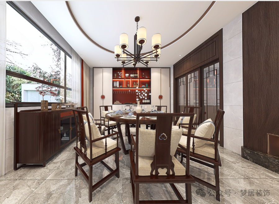 中式圓型天花設(shè)計(jì),下面擺上圓桌,整體下來(lái)也是很協(xié)調(diào)。深木色家具的搭配更顯大氣儒雅。