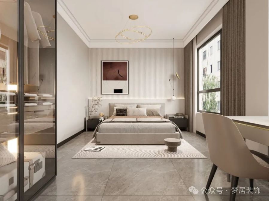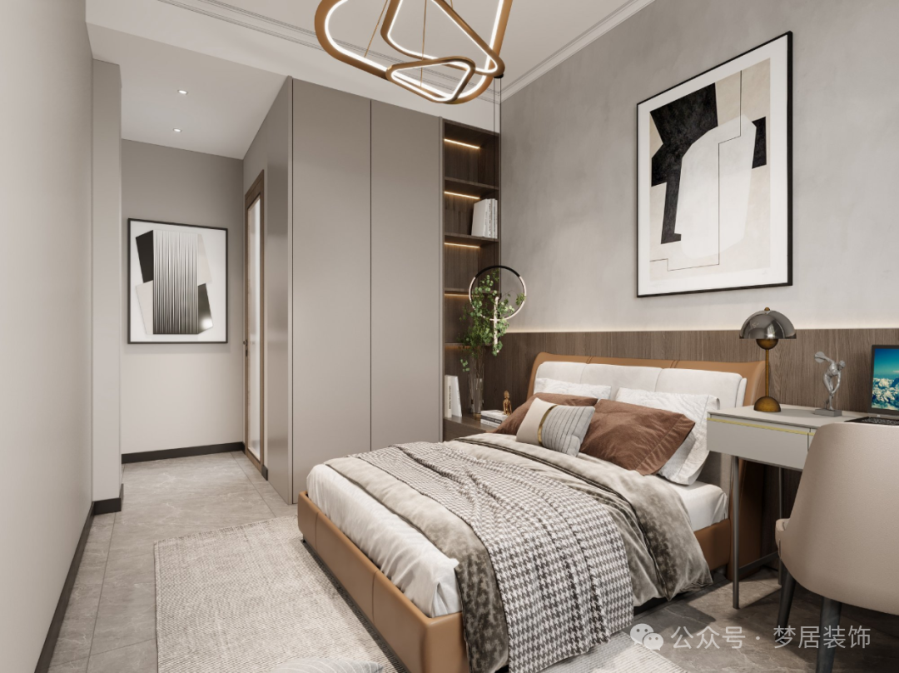 次臥設(shè)計(jì)手法和搭配上更現(xiàn)代時(shí)尚,不變的是色彩上的 “暖”基調(diào),營(yíng)造了空間的舒適和溫馨,軟硬裝搭配和諧統(tǒng)一。