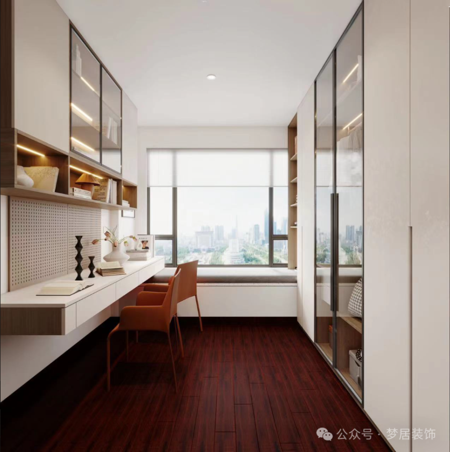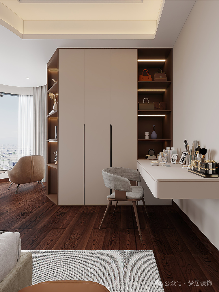 衣帽間同時作為書房在使用,方便工作也方便衣物收納。泡一杯咖啡,在書桌開啟專注工作,累了可以看看窗外眺望遠方。