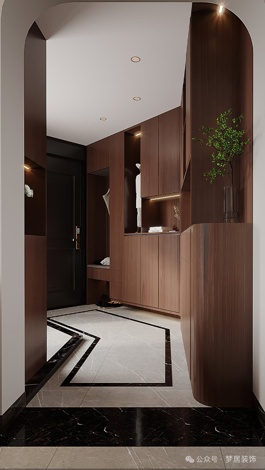 玄關與大廳之間形成一個自然的轉折,保持室內的私密性,搭配實木玄關柜,方便日常穿鞋拿取,入戶空間寬敞,實現大柜體的收納,讓歸家更加舒適妥帖。