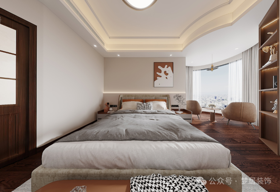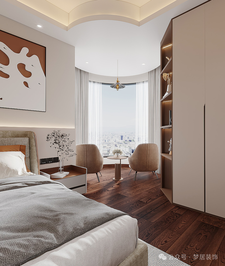 主臥顏色選用淺杏色進行搭配,燈光作為點綴,舒適而靜謐,生活溫馨且舒適。褪去一身的繁華在椅子上看書休息,看著窗外城市的夜景好不愜意。