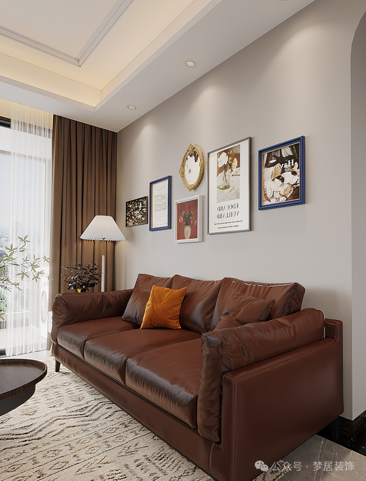 整體空間以復古的焦糖色為主,皮質沙發、摩登個性的掛畫和金屬元素點綴,美式復古氛圍更濃郁,搭配復古花紋的地毯,電影感氛圍滿滿。