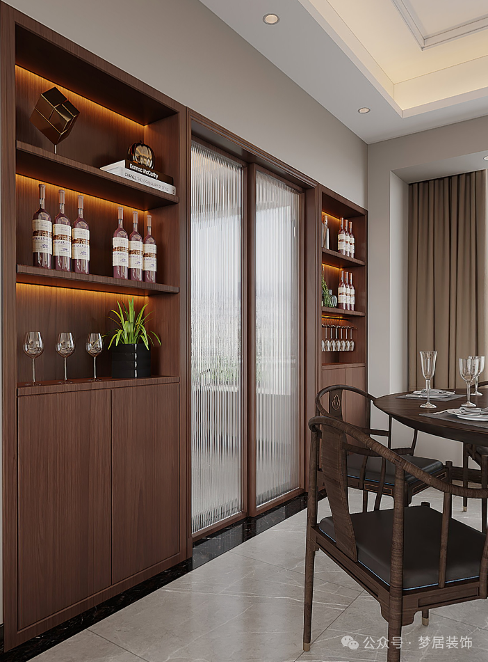 餐廳頂面做了流暢舒適的跌級吊頂,從視覺上拉高層高,增加設計感;擴大廚房的門洞,兩側做了嵌入式餐邊柜,長虹玻璃提高整體空間的通透性,做飯的時候不用擔心油煙的問題。