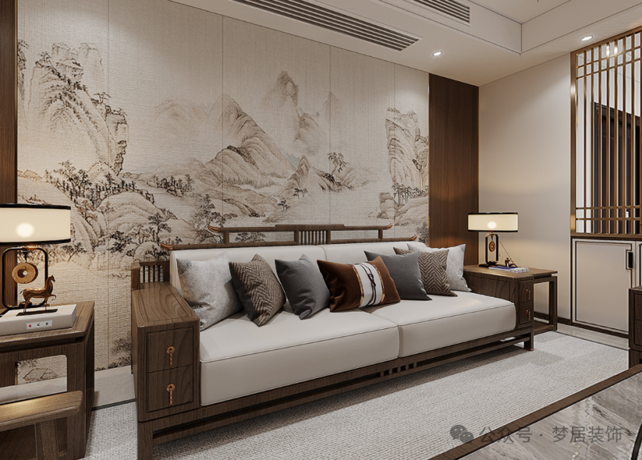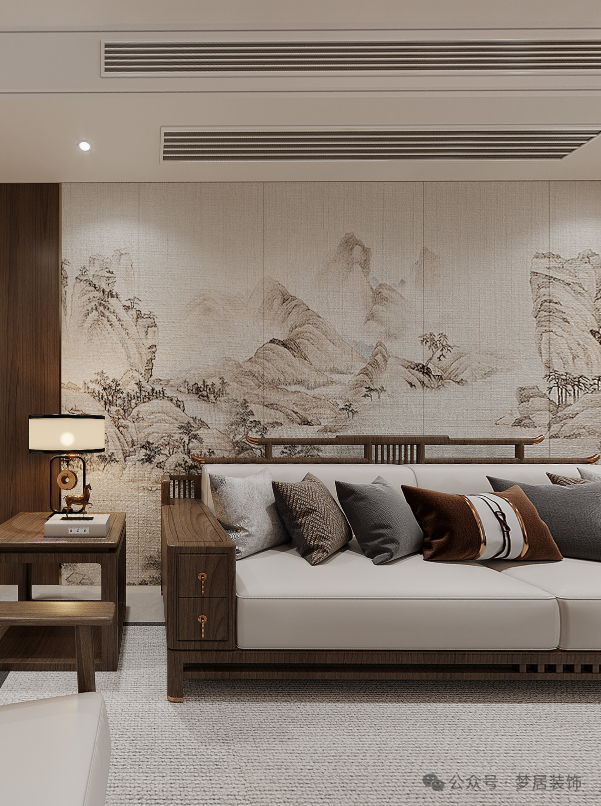 客廳沙發(fā)背景墻以一幅典雅的中式山水畫帶出新中式的氛圍感。兩邊的原木色木飾面和中間的山水畫搭配相得益彰,帶出中式裝修的對稱之美。新中式臺燈非常和諧,中式的山水韻味相當有格調(diào)!