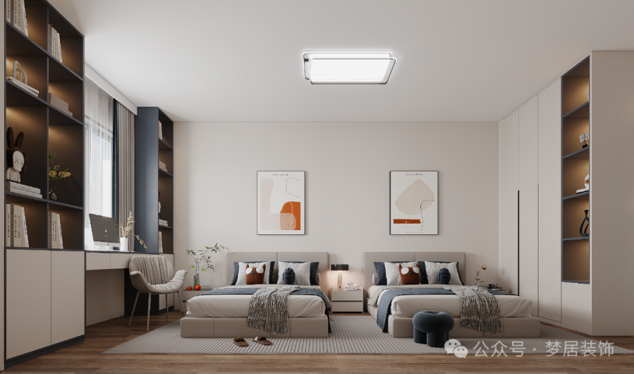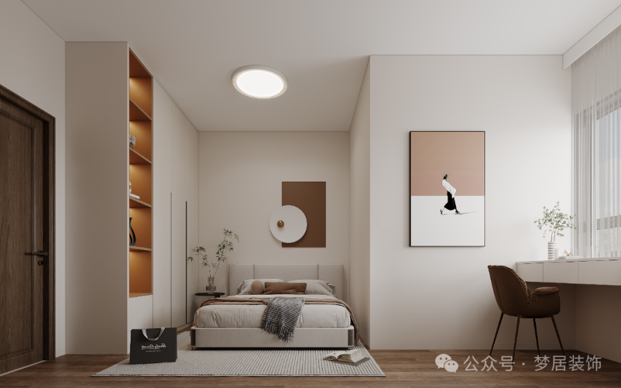 女兒房以淺色系鋪設,有著良好的采光與景觀視線。空間簡潔利落,照明均勻舒適,選用膚感衣柜材質(zhì),以功能性為引導打造學習區(qū)域,讓臥室空間生出安靜美好的生活感。