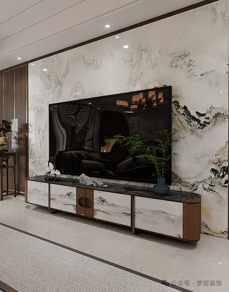 電視背景墻選用巖板肌理細膩自然,柔和細膩的視覺體驗賦予現(xiàn)代輕奢的氛圍,搭配成品電視柜,勾勒出豐富的層次感,增加了空間的立體感。