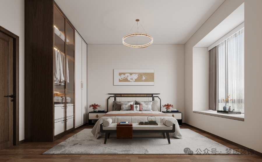 長輩房延續(xù)了新中式風格格調(diào),全屋色調(diào)整體統(tǒng)一。這也是征求了業(yè)主父母的意見之后,再決定這樣去整體布置設計的。房間內(nèi)配備了套衛(wèi),方便業(yè)主父母生活起居。