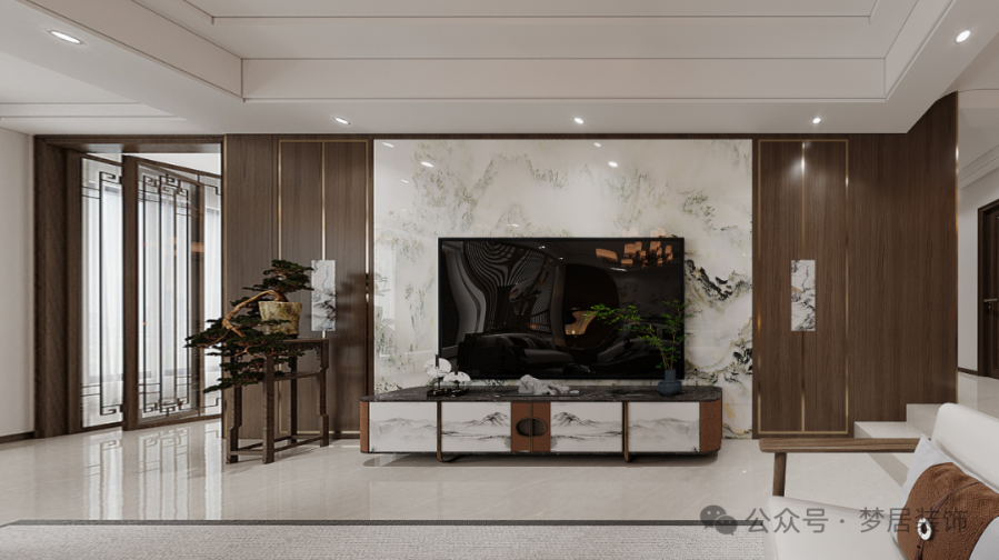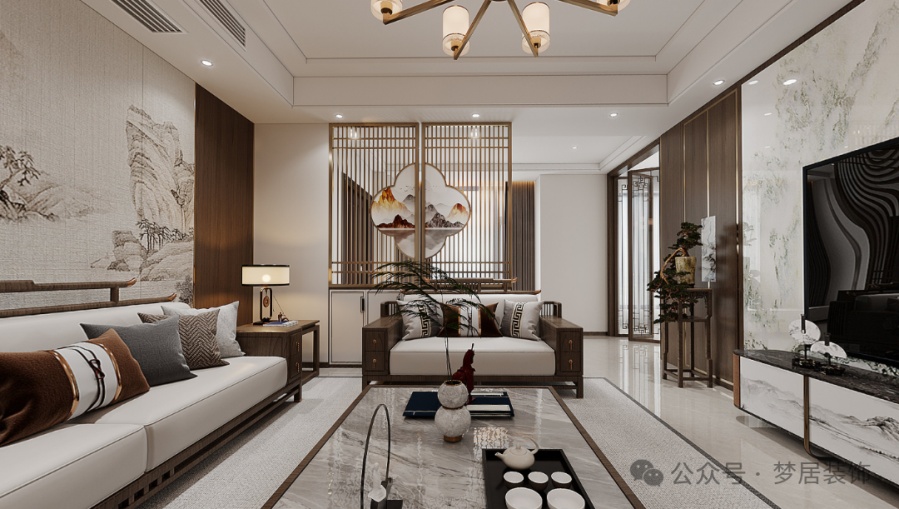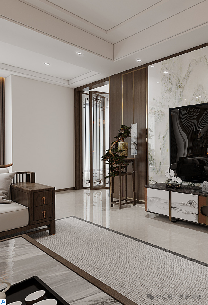 開門入戶,將門廳至客廳利用玄關柜和簡約中式屏風做隔斷,解決入戶收納問題又可以維護空間私密性,空間開闊通透。頂面利用吊頂拉開空間視覺,豐富空間層次。