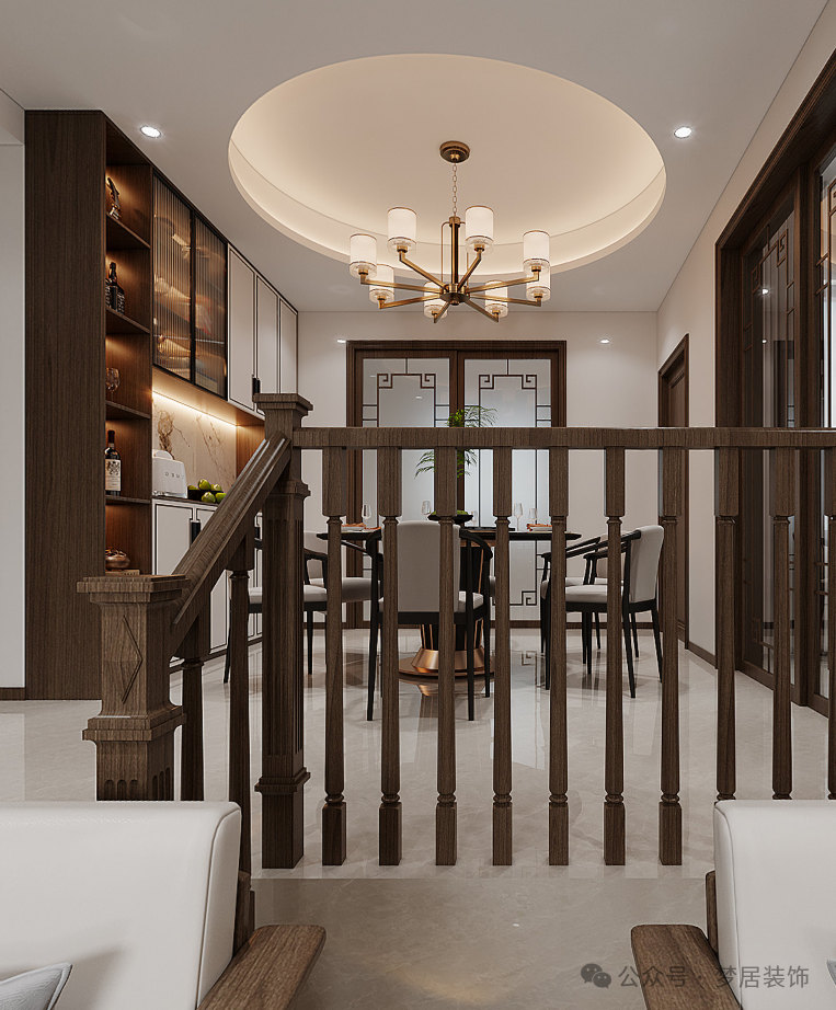 客廳做了下沉式設計,餐廳以及其他抬高的空間通過高低差結(jié)構(gòu),讓空間框架變得更有層次感和立體感,帶來獨特的視覺效果。一組到頂?shù)牟瓦吂駜?/span>物功能強大,搭配柔和的暖色燈光,中式的吊燈將用餐氛圍感拉滿。