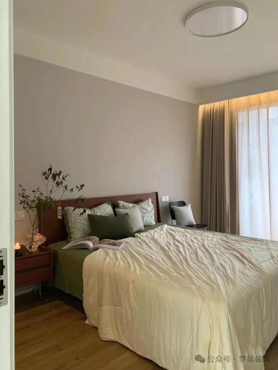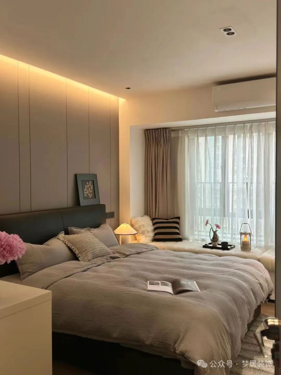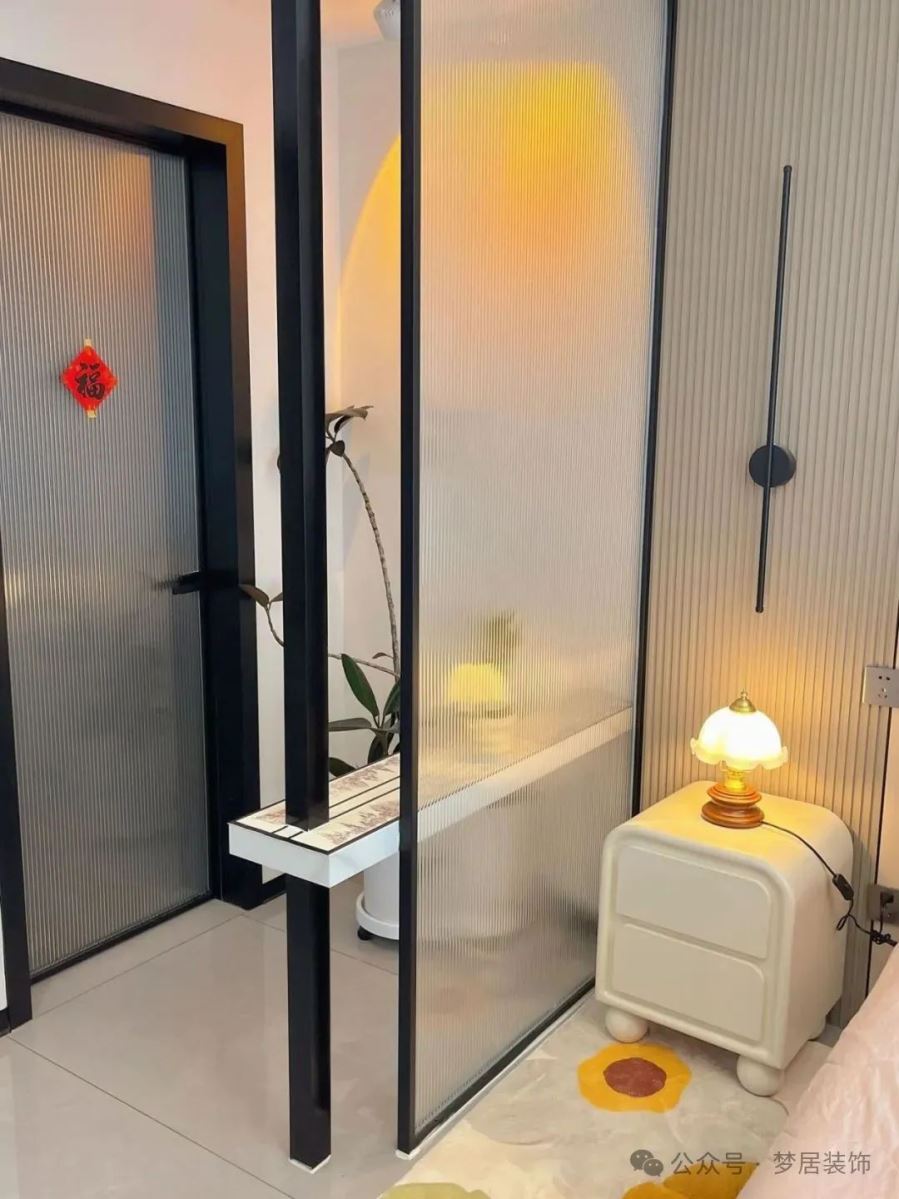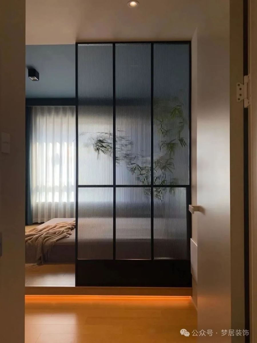 建議可以考慮以室內窗的形式,來改善臥室的采光與通風,讓視覺更通透,空間也更有層次感了。