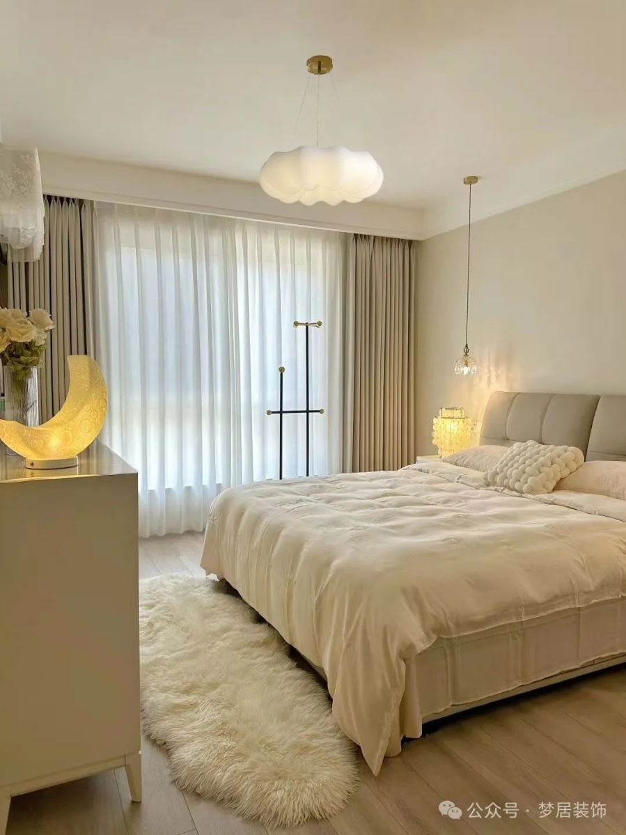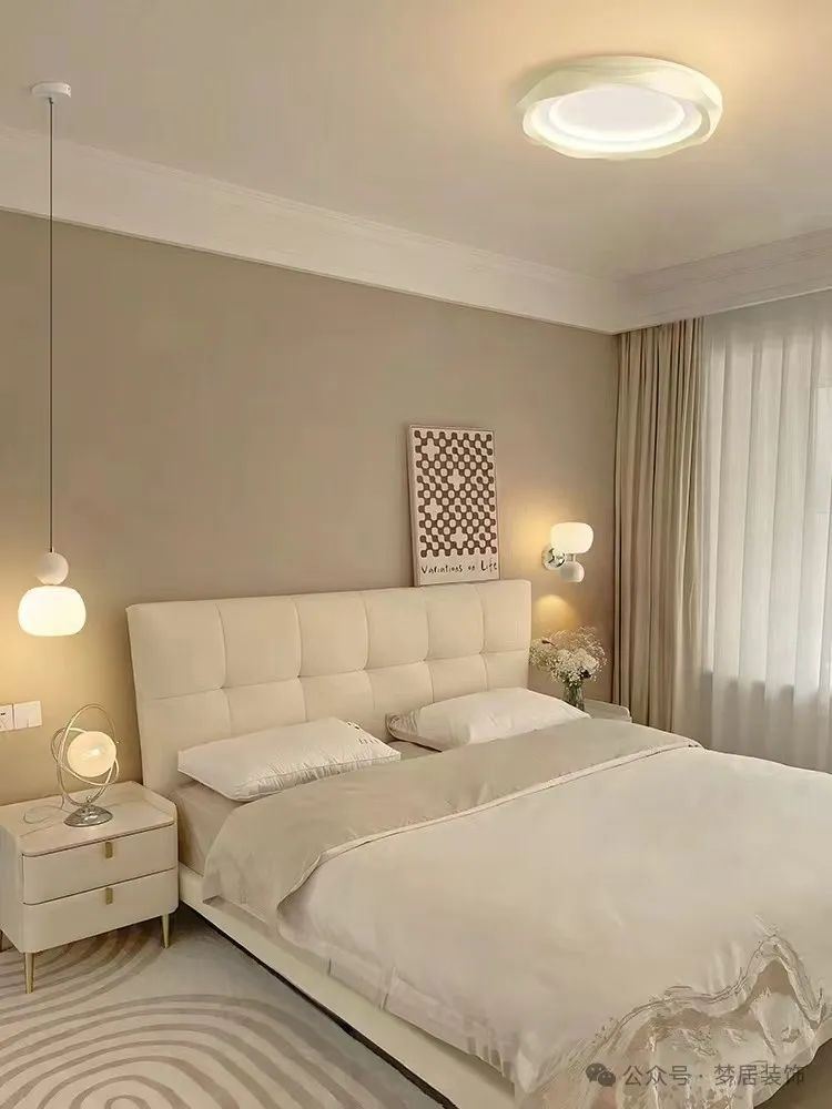 建議:盡量保持床正上方的空間空曠干凈,安裝燈具可以選擇吸頂燈,簡約大方;或者采用無主燈設計,搭配床頭小吊燈,會更有氛圍感;如果要選擇吊燈盡量選擇輕盈一些的裝飾燈。