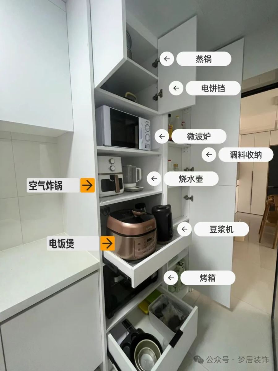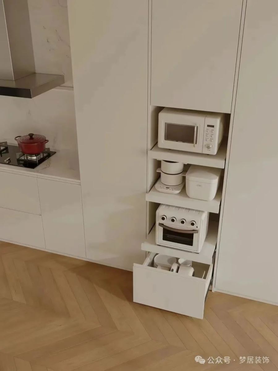 一般人家的廚房,小電器總是堆在一塊使用時(shí)才拿出來,烹飪好后再放回去,使用過程非常麻煩。不如直接做一個(gè)專門的小家電收納高柜。