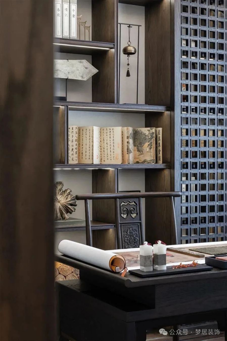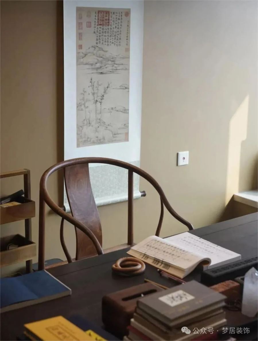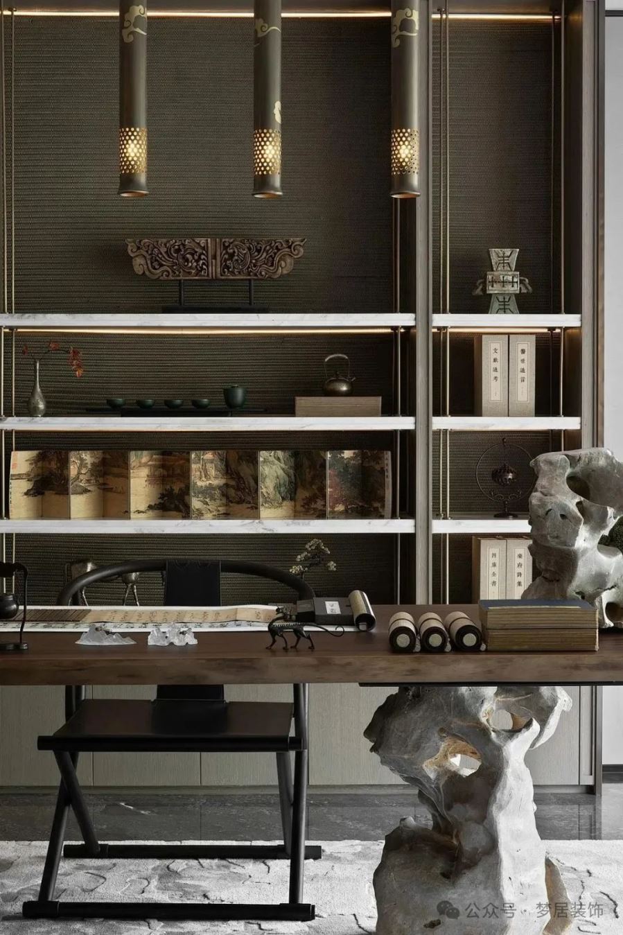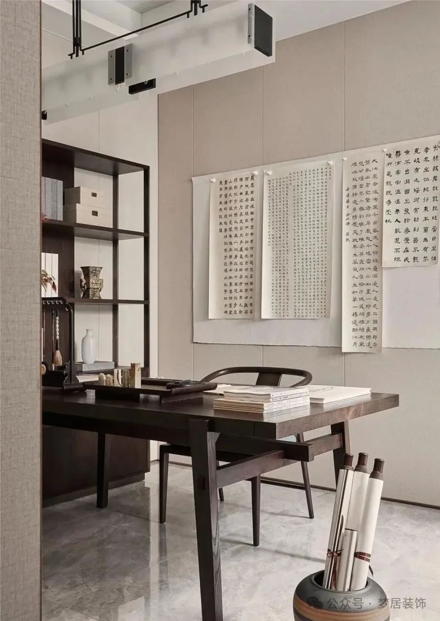 以筆墨元素衍生,提升整個空間的藝術格調,讓中式韻味變得更加飽滿,極大地增加書房的文化氣息,又顯底蘊和品位。