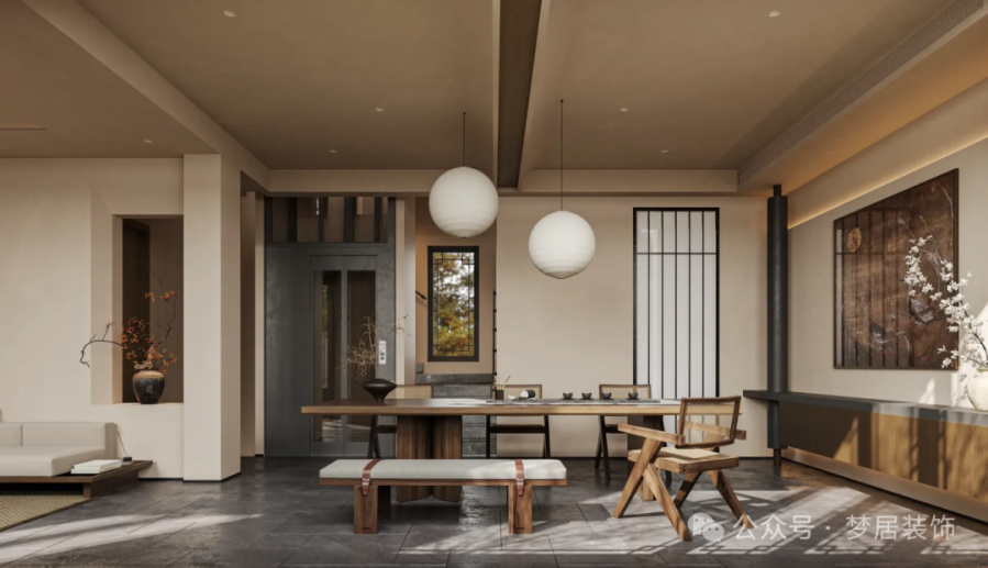 將山水理想寄情于庭院屋舍當(dāng)中,舍中有景,景中有舍。山水風(fēng)景、人文理想微縮于現(xiàn)代室內(nèi)空間,承載國(guó)人的山水情思寄托。