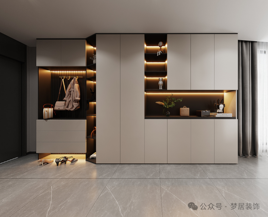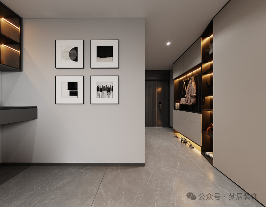 原本的玄關為室外空間,連接著客廳陽臺,后來通過拆除陽臺與室內連接的非承重墻、陽臺封窗之后與室內空間合并一體,空間更寬敞,舒適感翻倍提升。