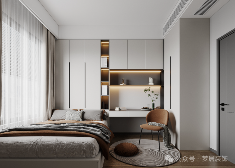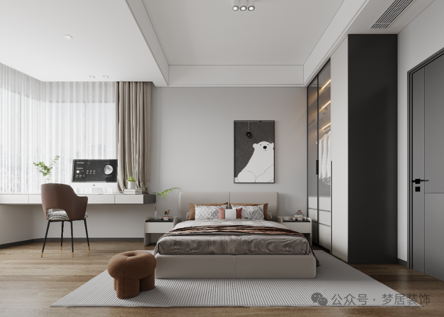 兒童房原來的陽臺也一并并入室內空間,打造學習區與收納區。木色與淺灰的碰撞讓臥室看起來更高級。