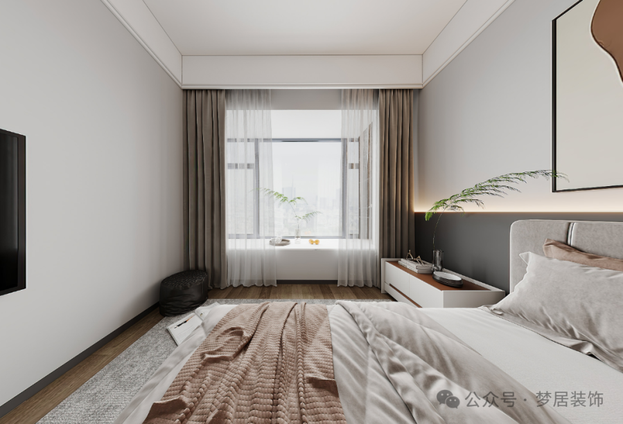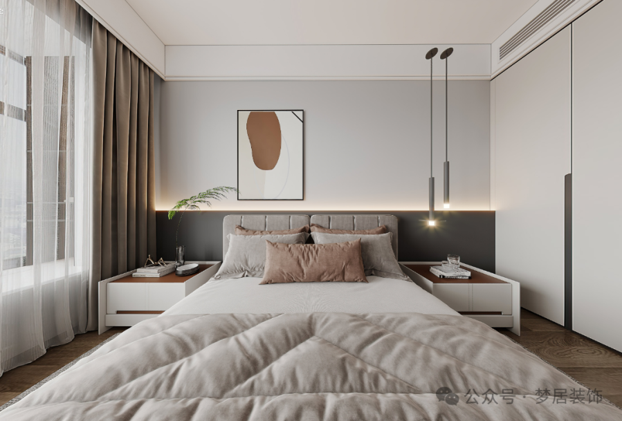 主臥背景墻的設計融合了裝飾性與功能性,暗藏燈帶增加室內光線,增強空間氛圍。搭配舒適床品,空間細膩又富有層次感。定制柜與墻面保持同色系,格局整潔有序。