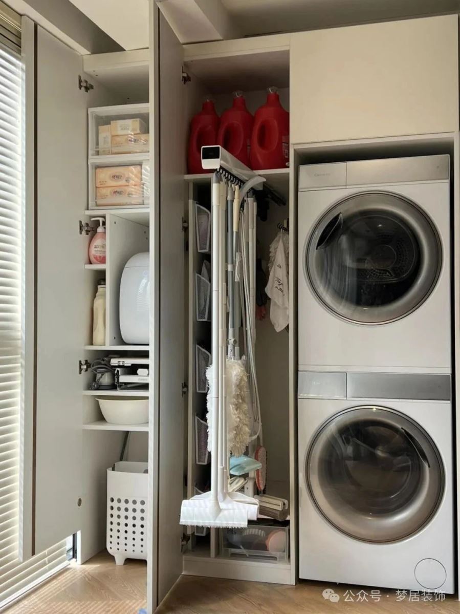 如果空間較窄,可以將洗烘套裝嵌入,家政柜與洗衣區結合。