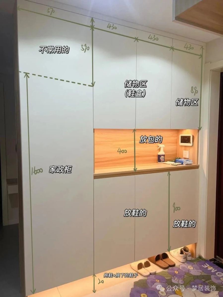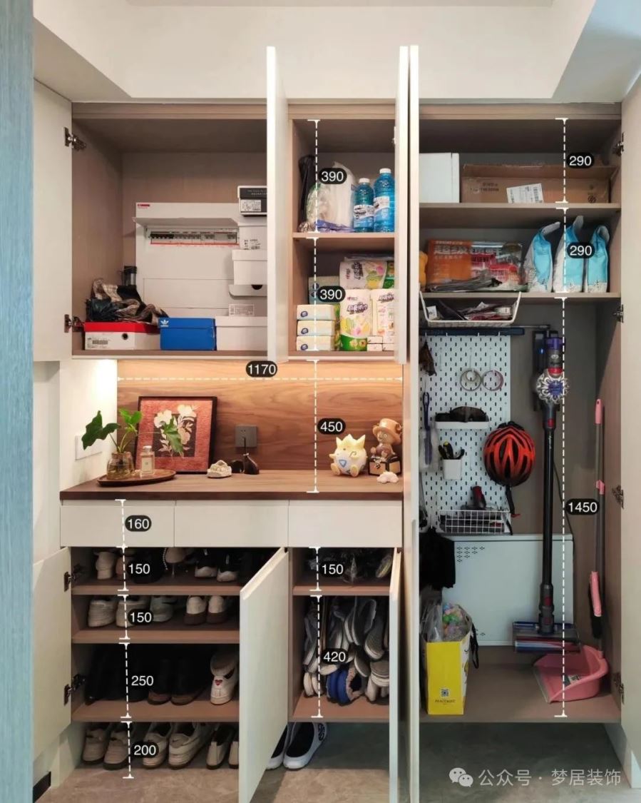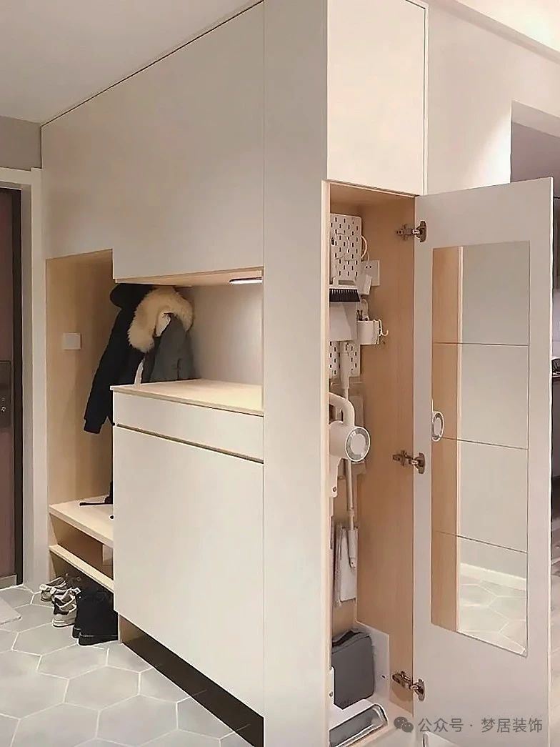 很多家庭的玄關鞋柜其實還有很大開發潛力,如果鞋柜厚度夠深,可以與家政柜功能結合,做到“一柜多用”。