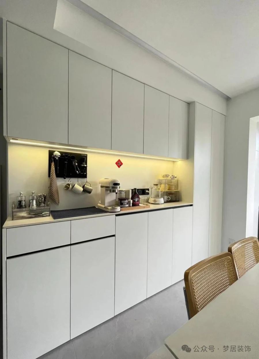 開放格與封閉空間相結合,餐邊柜+家政高柜的設計在視覺上也更美觀更有層次感,讓家務收納更加方便順手。