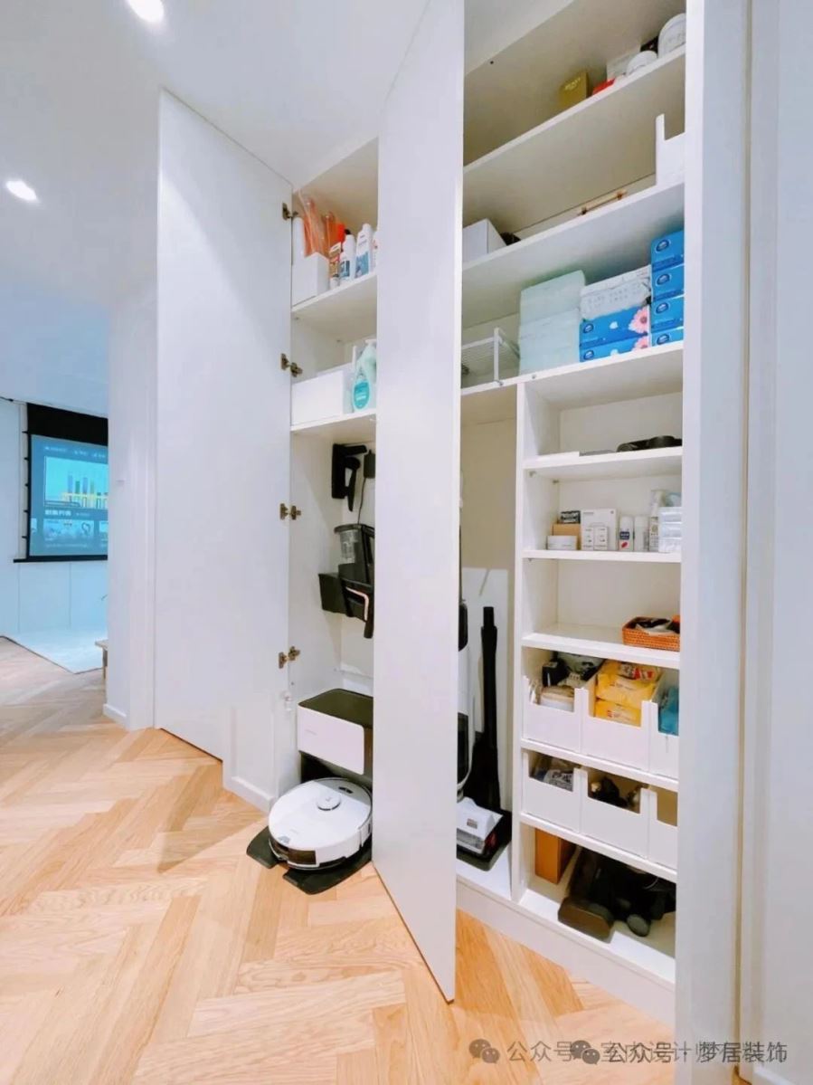 鞋柜深度在40厘米以上的話,可以做一個側邊家政柜,用來收納日常清潔工具。配置洞洞板,安裝掛鉤收納一些小工具,預留出插座給掃地機器人、吸塵器、掛燙機這些東西充電。