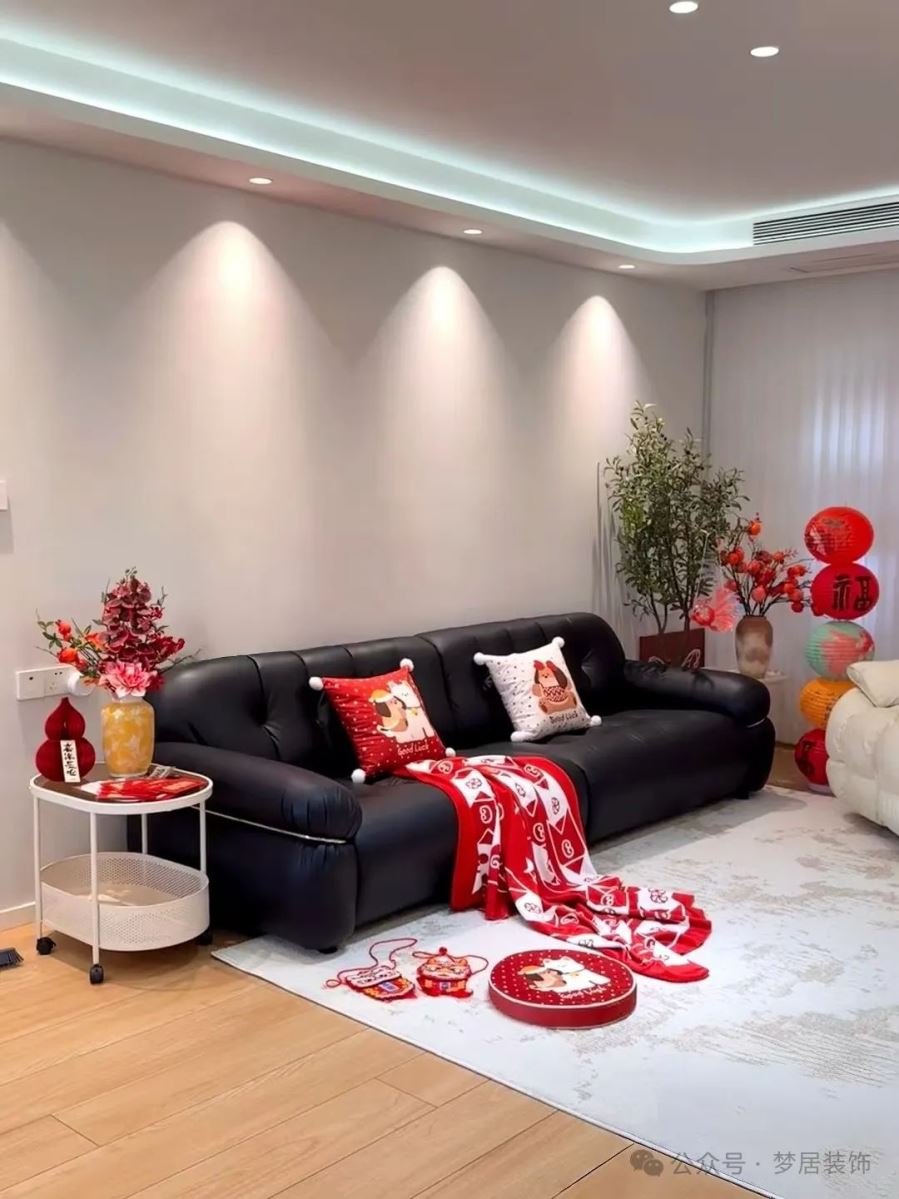 抱枕與搭毯:無(wú)需將整個(gè)沙發(fā)換成紅色,沙發(fā)添幾個(gè)紅色抱枕或一張毛絨絨的搭毯,就能輕松營(yíng)造出新年的氛圍。