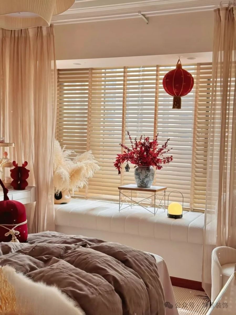 臥室不需要過多的變動(dòng),在原有的基礎(chǔ)上做"加法",擺放新年裝飾物,添加一些紅色的元素,滿滿的新年氣息。