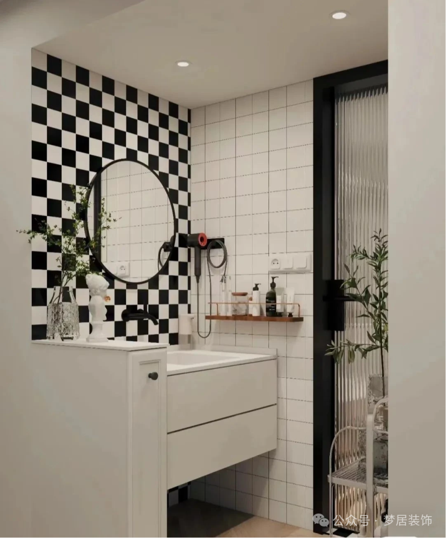 洗手臺外移后,洗漱區(qū)的墻面建議用瓷磚。瓷磚防水性能好,而且耐臟、易清潔,水漬污漬一抹就干凈。