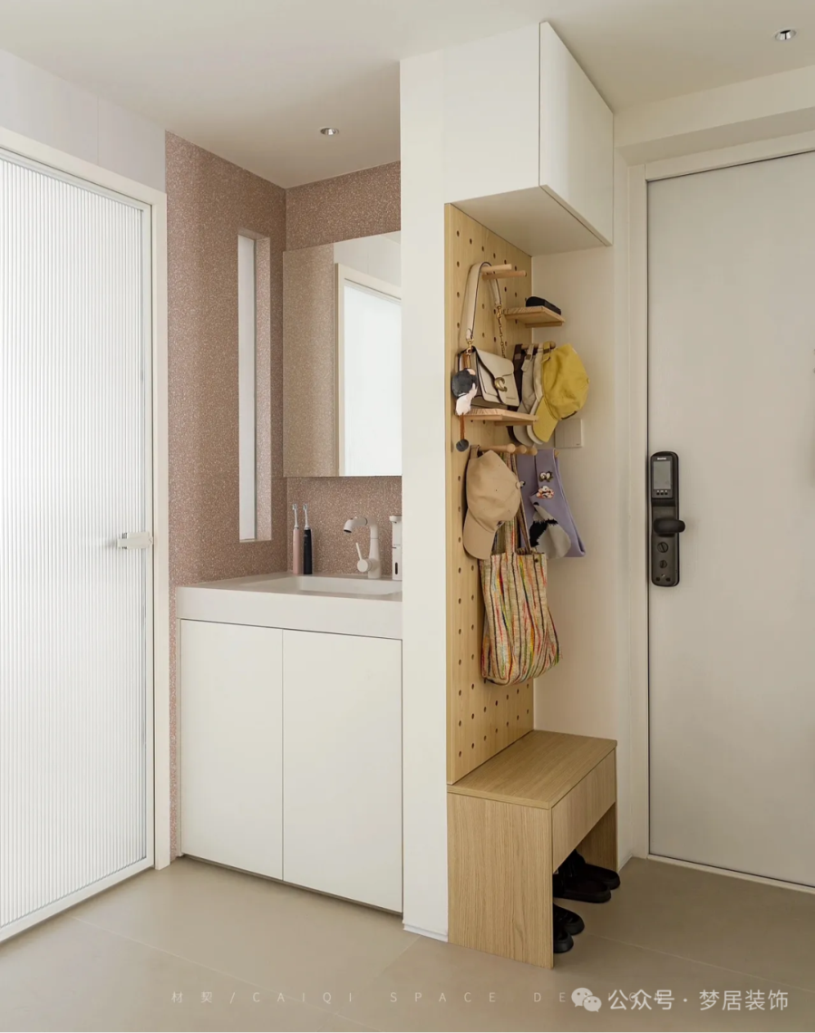 將洗手臺設(shè)計在玄關(guān)附近,回家后可以直接洗手消毒。進門左側(cè)是換鞋凳+洞洞板+吊柜,換鞋凳可以坐下來換鞋,洞洞板收納包包小飾品,吊柜則收納玄關(guān)的雜物。