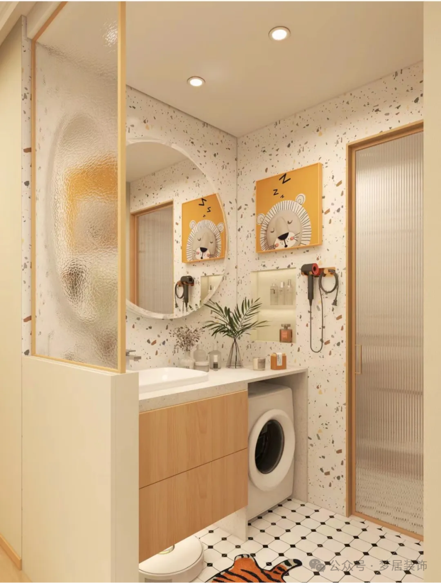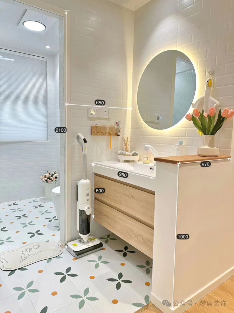 將洗手臺移到衛(wèi)生間門外后,用半墻隔斷進行遮擋。半墻高度一般在1.0~1.2米,既能隱藏洗漱用品,又不會顯得壓抑。