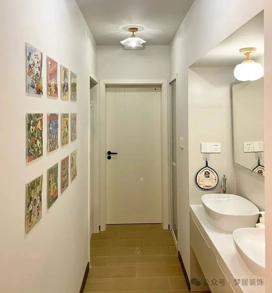 對于有走廊的家庭,洗手臺外移至走廊可以充分利用空間。這種設(shè)計不僅解決了衛(wèi)生間擁擠的問題,還能讓走廊看起來更有設(shè)計感。