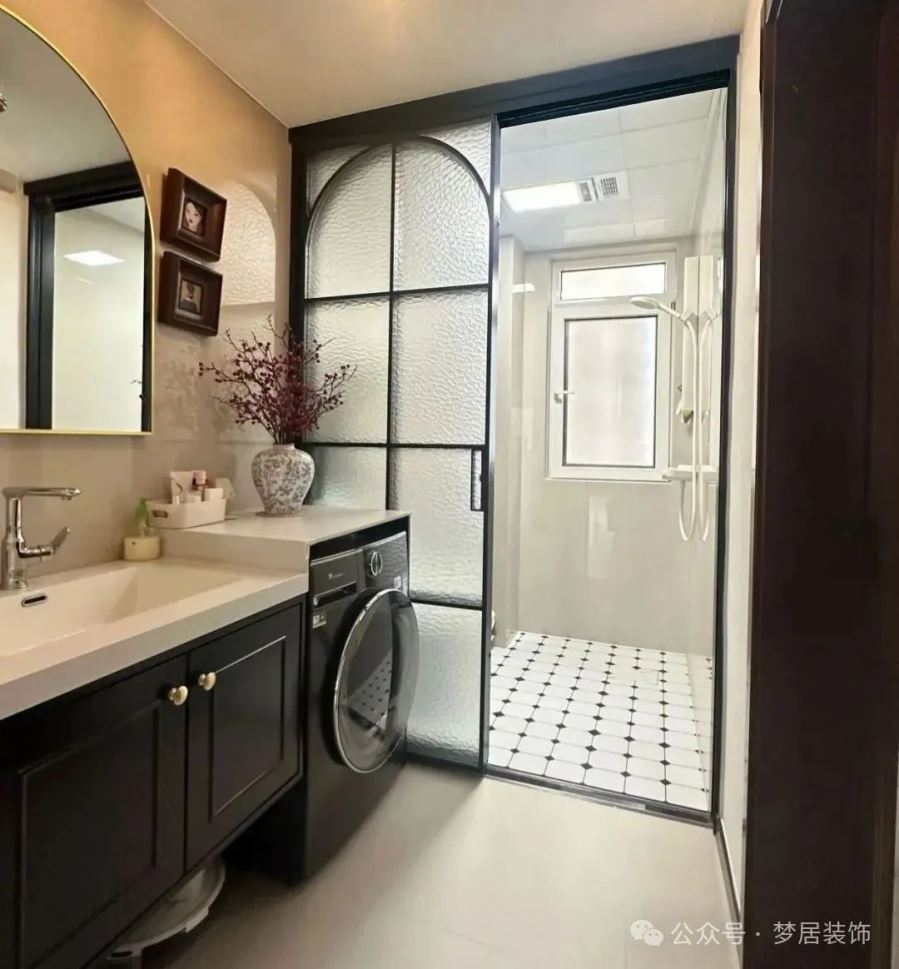 如果擔(dān)心半墻不夠美觀,可以選擇半墻+玻璃隔斷或純玻璃隔斷。長虹玻璃、磨砂玻璃等材質(zhì)既透光又不透人,能有效隔斷洗手臺區(qū)域。這種設(shè)計能讓空間看起來更通透整潔。