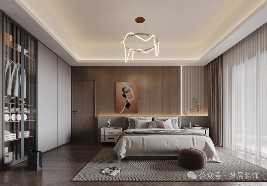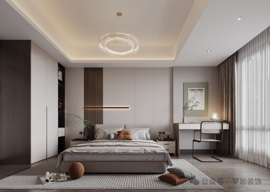 主臥為了給業主打造一個恬適的睡眠空間,設計上也更加注重舒適與品質。地面鋪設實木地板,一張舒適的大床成為空間的視覺中心,兩側擺放對稱的床頭柜,綠植和小擺件營造出溫馨自然的休憩氛圍。