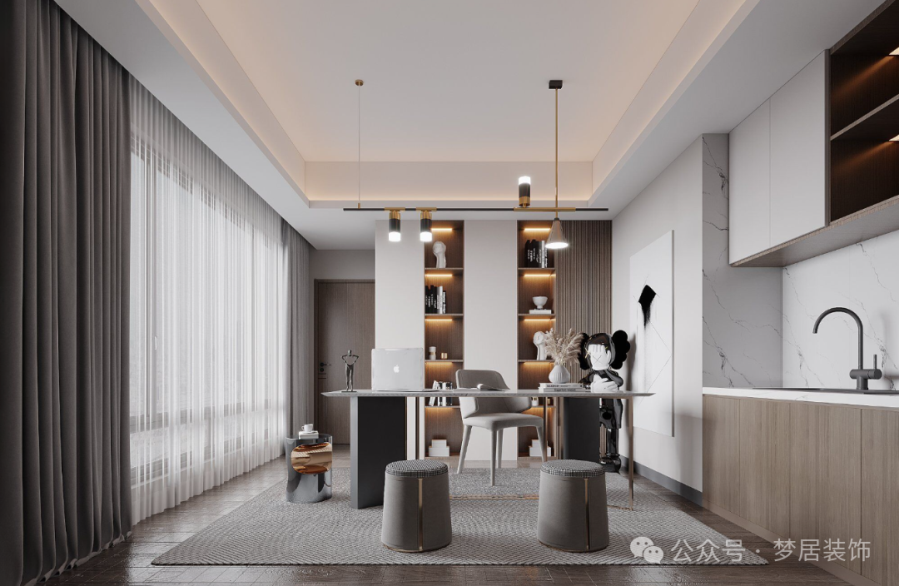 書房將現代輕奢風格的優雅與功能性完美結合,簡潔又不失穩重。造型別致的吊燈,提升空間格調。配置了水吧臺,閑暇時可以泡上一杯喜歡的咖啡,在這里靜心閱讀,享受休閑時光。