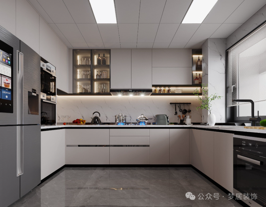廚房采用U型布局,充分利用空間,提高操作效率。整體空間簡潔明亮,簡潔的造型搭配免拉手設計,細節處彰顯輕奢品質。廚房電器全部采用嵌入式設計,空間整潔統一。集成吊頂搭配嵌入式LED 平板燈,提供充足的照明。