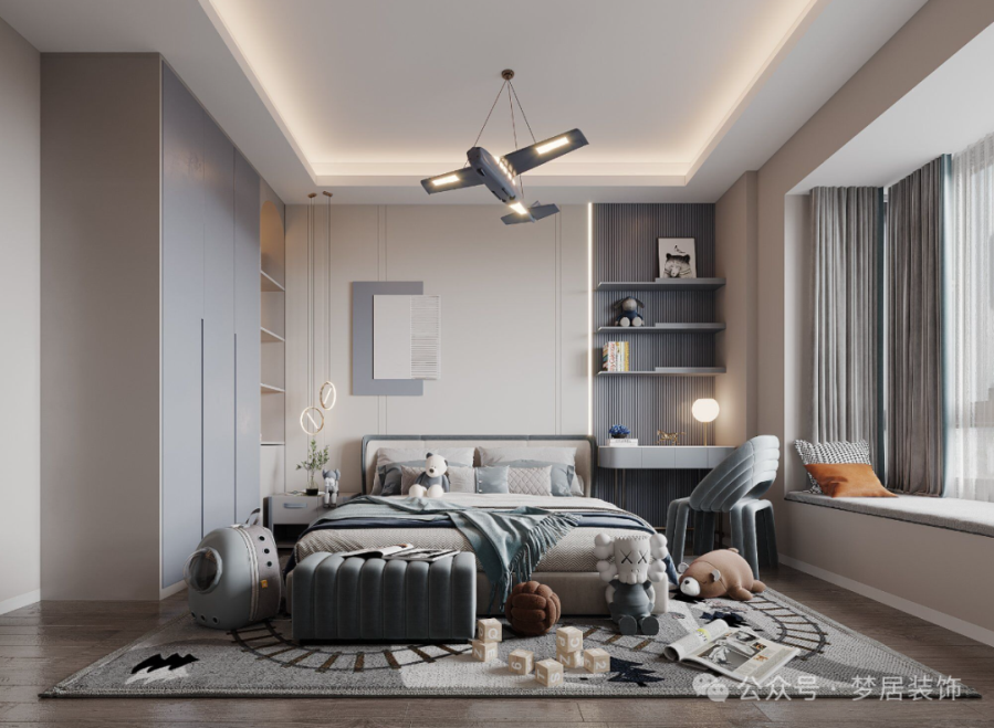 男孩房的設計活潑可愛,色彩上選用藍色與淺灰的搭配,可愛的造型燈與玩具營造出活潑童真的氛圍,莫蘭迪色彩帶來安靜、溫馨的空間情緒。懸浮式的書桌搭配小臺燈,為孩子帶來舒適的閱讀學習環境。